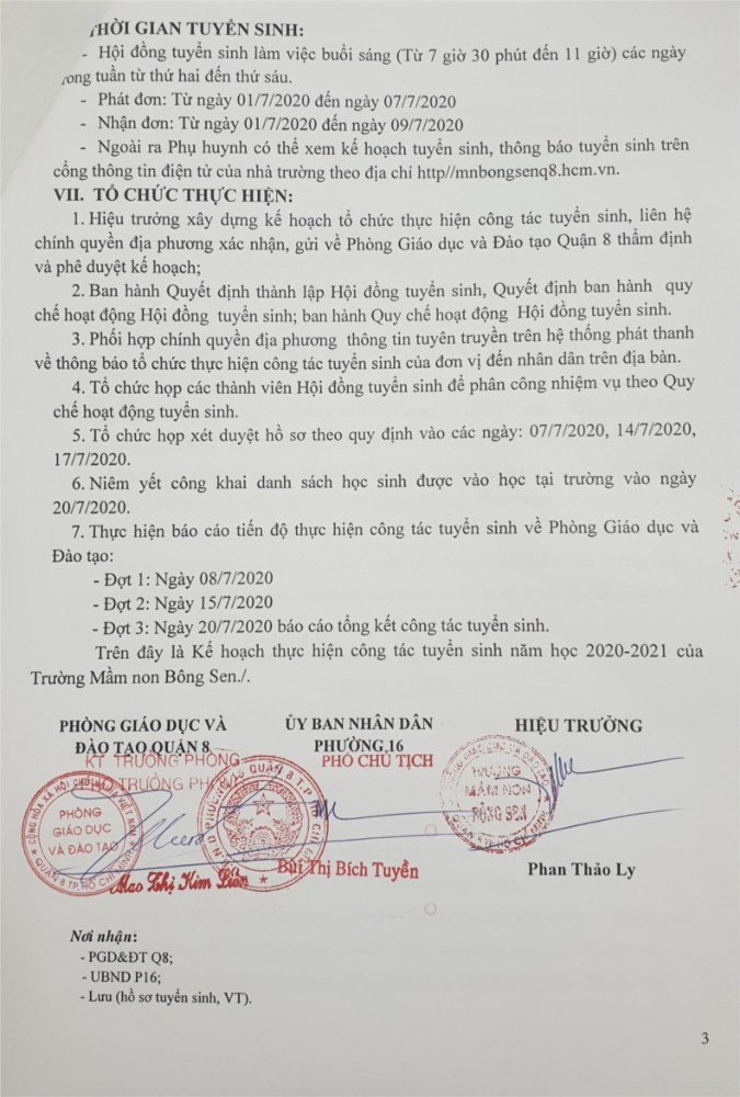 Căn cứ Kế hoạch số 22/KH-MNBS ngày 17 tháng 6 năm 2020 của Trường Mầm non Bông Sen về Kế hoạch thực hiện công tác tuyển sinh năm học 2020-2021;